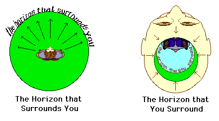 The internal infinity refers to the notion that information can be expressed accurately at any size if the interrelationships remain constant. So nature's compression algorhythm does that, it continually compresses the sensory information, which in turn allows us the perception of great distance within our minds. Our perceptual powers exist, not at the center, but as a horizon ring or sphere of perception between an inner and an outer reality. The general concept can by more easily understood using this illustration: